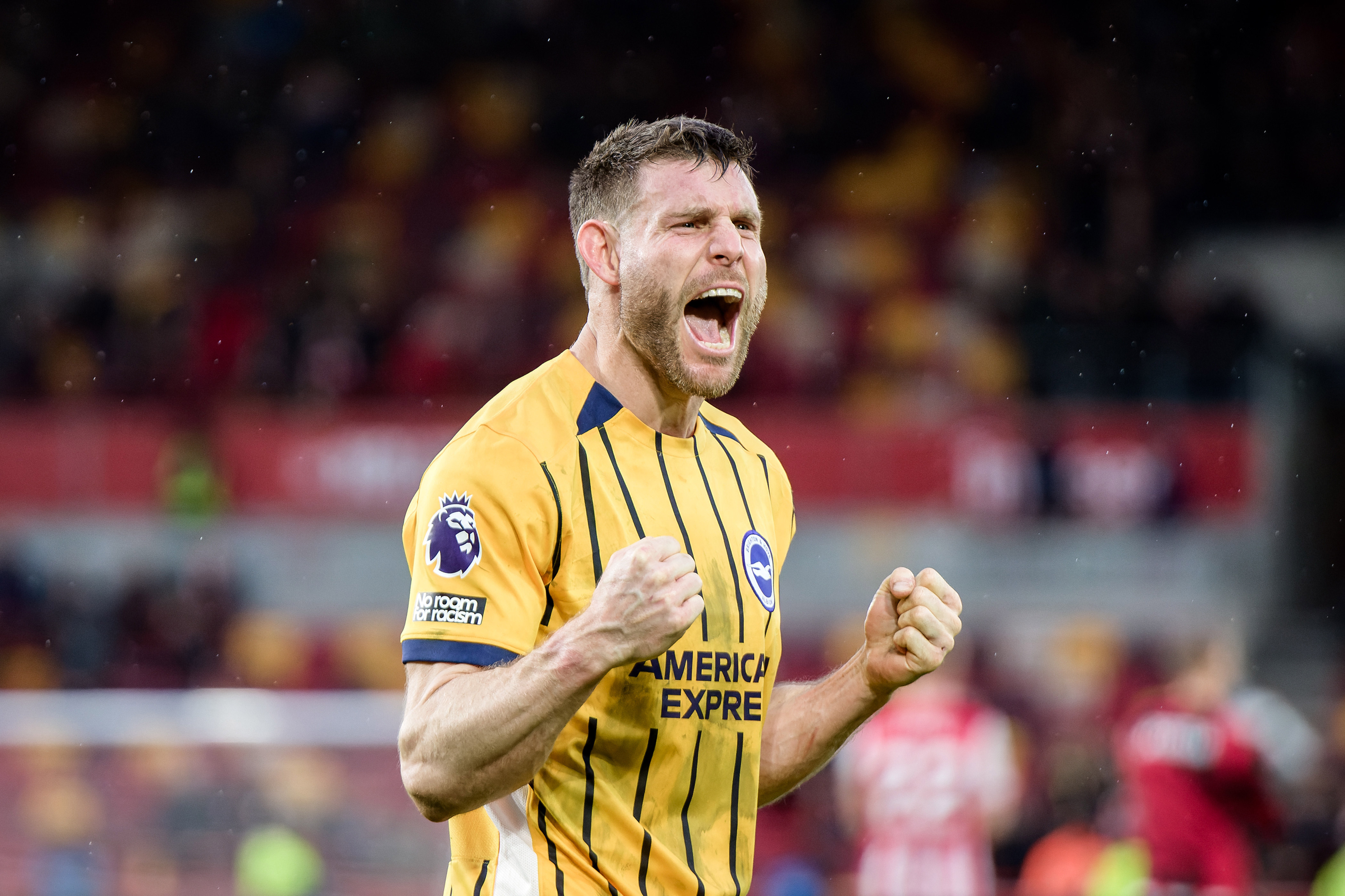 جيمس ميلنرلاعب برايتون آند هوف ألبيون يحتفل بفوز فريقه 2- 0 بعد نهاية مباراته أمام برنتفورد بالدوري الإنجليزي الممتاز لكرة القدم في لندن يوم السبت - (Photo by Pedro Porru/MB Media/Getty Images)