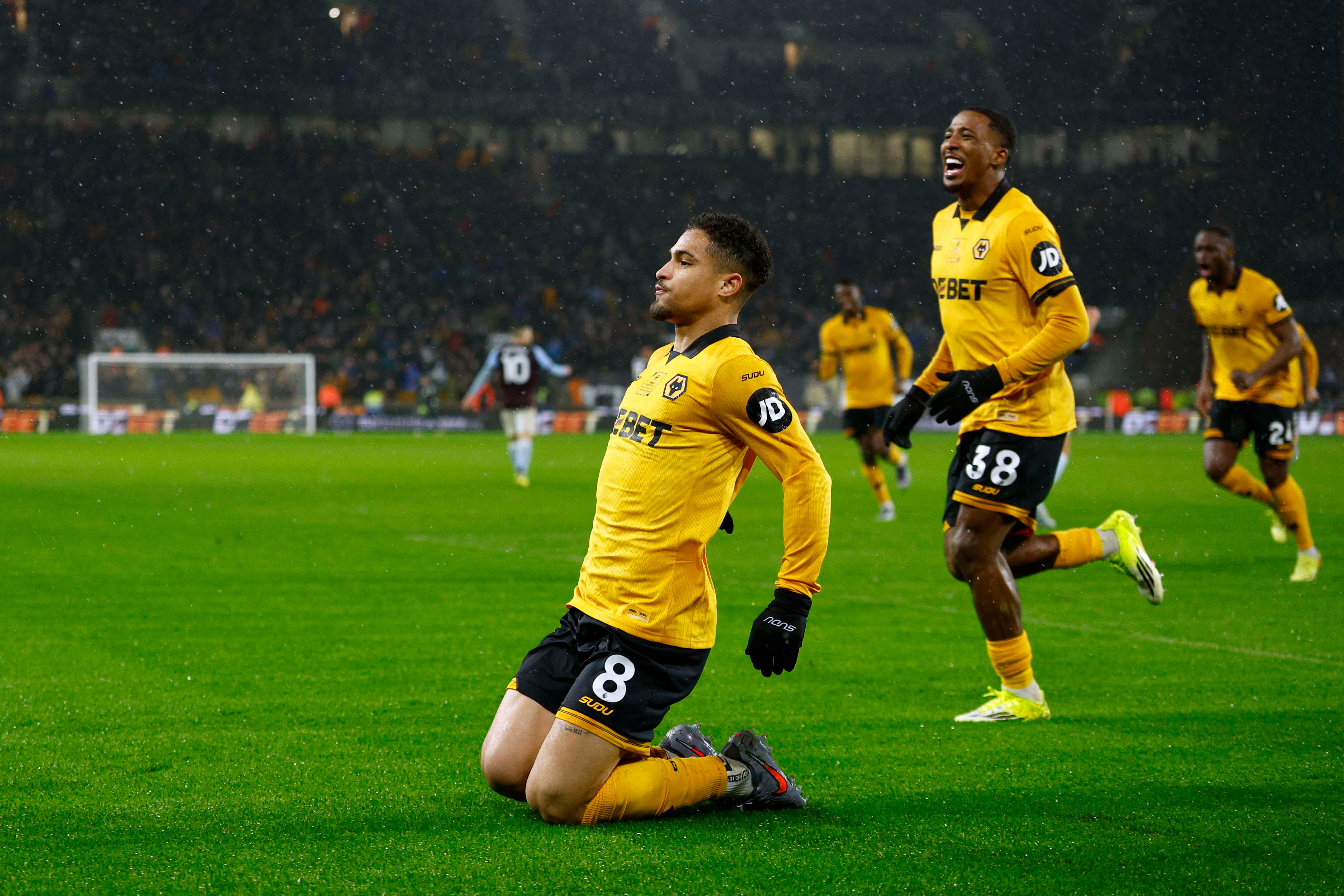 جواو جوميز لاعب ولفرهامبتون واندرارز يحتفل بتسجيله الهدف الأول لفريقه في الفوز 2-صفر على أستون فيلا في الدوري الإنجليزي الممتاز لكرة القدم يوم 27 فبراير شباط - (Photo by Malcolm Couzens/Getty Images)
